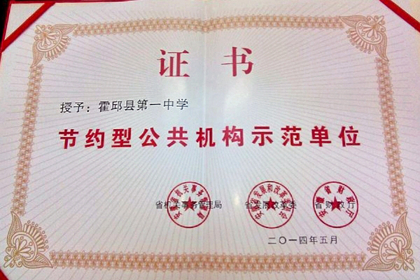 7月底,霍邱一中獲安徽省機(jī)關(guān)事務(wù)管理局、安徽省發(fā)改委、安徽省財(cái)政廳聯(lián)合頒授的“安徽省節(jié)約型公共機(jī)構(gòu)示范單位”榮譽(yù)稱號。