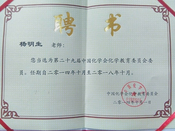 9月16日,霍邱一中校長楊明生接到中國化學(xué)會化學(xué)教育學(xué)科委員會正式聘書。