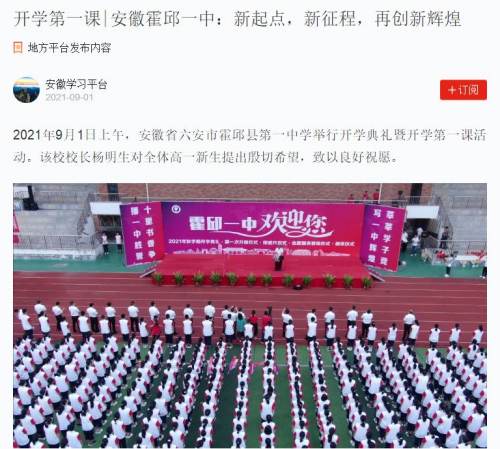 9月1日,“學(xué)習(xí)強(qiáng)國(guó)”安徽學(xué)習(xí)平臺(tái)發(fā)文,推介了霍邱一中開學(xué)典禮。