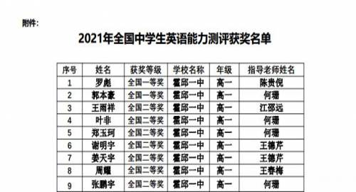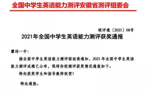 通報稱,在2021年全國中學(xué)生英語能力測評中,霍邱一中96名參賽同學(xué)獲獎,其中,羅彪等3名同學(xué)獲全國一等獎,王雨祥等22名同學(xué)分獲全國二等、三等獎,另有付應(yīng)和等同學(xué)分獲安徽省一、二、三等獎。該組委會對霍邱一中師生表示祝賀。
