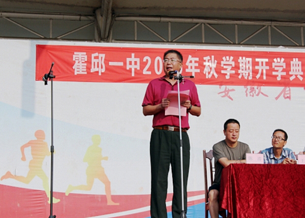 高三學(xué)生代表哈雷等朗誦長詩《霍邱一中歡迎你》,歡迎高一新同學(xué):“你們來了,沐著九月的溫暖秋陽,攜著家人的殷切希望,帶著恩師的諄諄教誨,揣著自己的遠(yuǎn)大理想;你們來了,掛著自信的微笑,唱著歡快的歌謠,踏著輕盈的節(jié)拍,……你們的到來為這片鐘靈毓秀的土地注入了新的活力,你們的到來讓這所將近百年的老校煥發(fā)出新的生機(jī)……親愛的同學(xué)們,夢就在前方,正等待著你們給它插上飛翔的翅膀;優(yōu)秀的學(xué)子們,讓我們手拉著手,肩并著肩,不忘初心,一往無前!……”