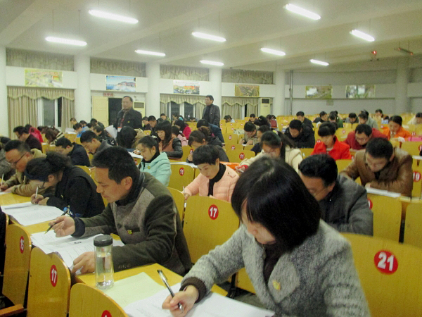 此次測試,報(bào)告廳一樓、二樓共設(shè)3個(gè)考場。凡承擔(dān)高考學(xué)科教學(xué)任務(wù)、年齡在45周歲以下的在崗教師必須參加;學(xué)校鼓勵(lì)45周歲以上教師參加測試。測試科目為高考考試學(xué)科,即語文、數(shù)學(xué)、英語、物理、化學(xué)、生物、政治、歷史、地理,共九科。試卷由兩部分組成:關(guān)于安徽卷與全國卷變化方面的比較,如兩種試卷各學(xué)科的命題特點(diǎn)、考點(diǎn)分布、難易度、試題題型、呈現(xiàn)方式、分?jǐn)?shù)設(shè)置等,占測試內(nèi)容的40%;全國卷高考真題,占60%。測試方式為閉卷考試,指定座位,由徐金忠、陳濤等部分班子成員監(jiān)考,并實(shí)行密封閱卷。考試時(shí)間為90分鐘,分值為100分。考試期間,“考生”對號入座,埋頭答題,“考官”輕移腳步,來回巡視,認(rèn)真“執(zhí)法”,考場秩序井然,無喧嘩、抄襲等違紀(jì)現(xiàn)象。