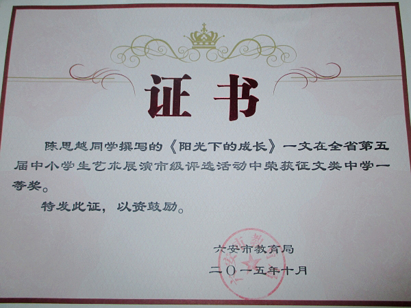 陳思越同學(xué)的作品《陽光下成長》獲征文類中學(xué)組市一等獎(jiǎng),陳士靜同學(xué)的作品《當(dāng)我站在舞臺(tái)上》獲征文類中學(xué)組市二等獎(jiǎng);霍邱一中選送的節(jié)目《鴻雁》、《掀起你的蓋頭來》、《師愛的頌歌》、《唐雎不辱使命》獲藝術(shù)表演類中學(xué)組市一等獎(jiǎng),《課堂》獲藝術(shù)表演類中學(xué)組市二等獎(jiǎng);劉小宇、劉啟明同學(xué)的書法作品獲作品類中學(xué)組市一等獎(jiǎng)……