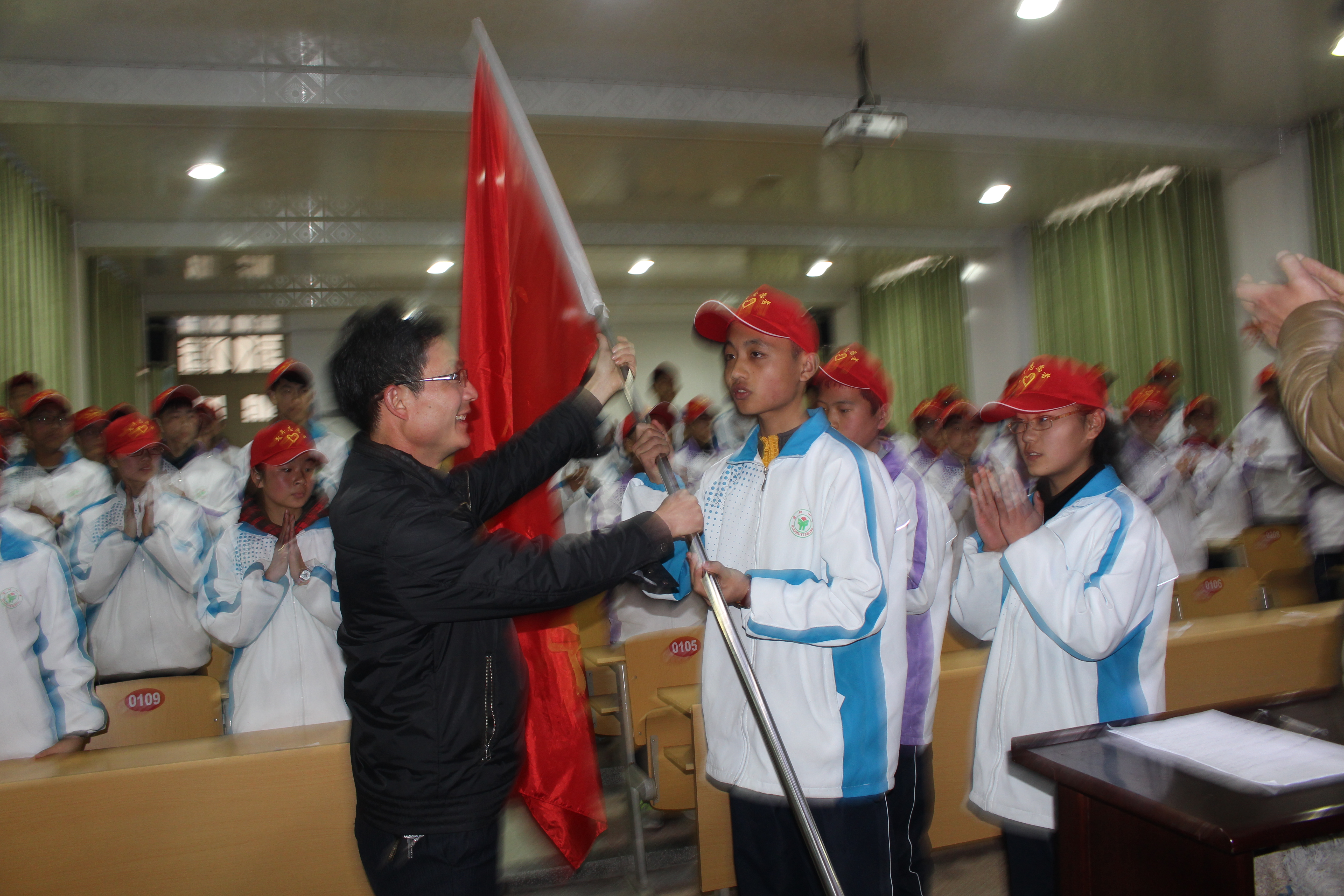 隨后在莊嚴的中國志愿者之歌的歌聲中,志愿者隊長王赫從政教處王厚軍主任手中接過了隊旗,并帶領(lǐng)全體志愿者宣誓:“盡己所能,不計報酬,幫助他人,服務(wù)社會。踐行志愿精神,傳播先進文化,為建設(shè)團結(jié)互助、平等友愛、共同前進的美好社會貢獻力量。”