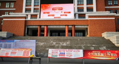 三、戶外大屏幕播放宣傳片,讓國(guó)家安全教育入腦入心。宣傳片告訴師生們國(guó)家利益高于一切,要履行衛(wèi)國(guó)之責(zé)。