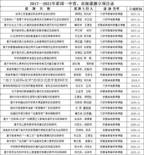 霍邱一中多年來重視引導教師參與課題研究,近年來,有數(shù)十項省、市級課題申報成功并順利結題,成果豐碩。在課題研究中,一大批教師獲得了專業(yè)成長和學術發(fā)展。同時,課題研究提高了學校整體教科研水平,推動了教育、教學和管理改革,從而提升了學校的辦學品位。