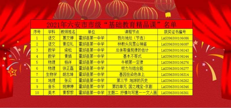 在2021年六安市“基礎(chǔ)教育精品課”遴選中,霍邱一中多名教師作品獲獎。