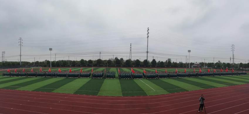 在莊嚴的國歌聲中,五星紅旗冉冉升起,全體師生肅立,向國旗行注目禮,軍訓匯報表演正式開始。