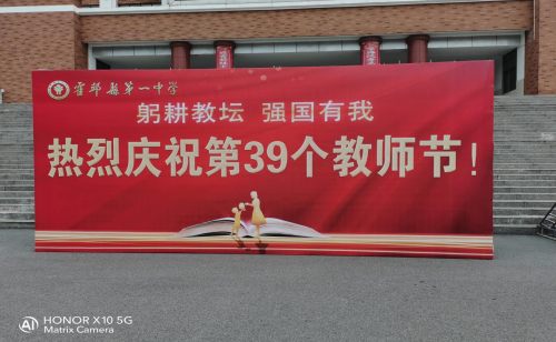 學(xué)校圖書館的LED戶外屏幕從9月9日早6點(diǎn)起至9月10日晚22點(diǎn),以字幕滾動(dòng)方式深情播出:“躬耕教壇,強(qiáng)國(guó)有我”、“老師,您好!”、“教師節(jié)快樂!”、“老師,您辛苦了!”、“賡續(xù)百年初心,擔(dān)當(dāng)育人使命”等標(biāo)語。