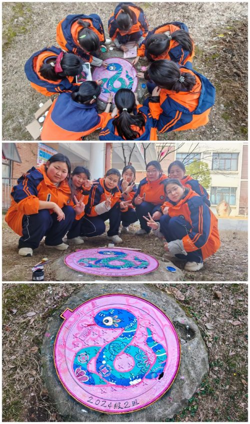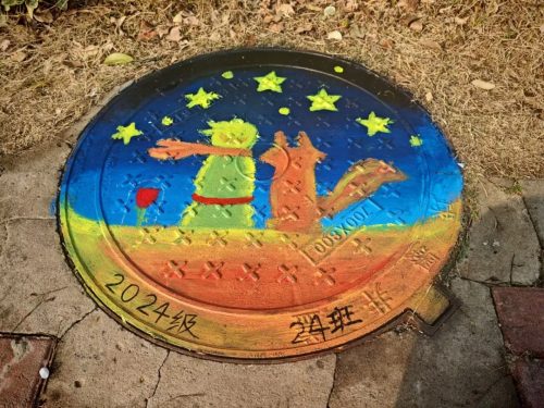 認(rèn)領(lǐng)之后,各班學(xué)生的熱情瞬間被點(diǎn)燃,思維的火花在校園的上空肆意迸發(fā)。他們手持畫(huà)筆,宛如靈動(dòng)的藝術(shù)使者,在井蓋這一方小小的 “畫(huà)布” 上精心勾勒、細(xì)細(xì)描繪。瞧,有的井蓋繪上了夢(mèng)幻綺麗的童話場(chǎng)景,灰姑娘在南瓜馬車(chē)那輕柔的笑語(yǔ)如在耳旁;有的展現(xiàn)著校園生活中充滿趣味的精彩瞬間,同學(xué)們課間的嬉笑打鬧、互助友愛(ài)躍然 “蓋” 上;還有的搭配著富含哲理的名言警句,一筆一畫(huà)間,智慧的光芒熠熠生輝。每一個(gè)井蓋,都被同學(xué)們注入了獨(dú)一無(wú)二的靈魂,冰冷的鋼鐵在他們的妙手下,煥發(fā)出無(wú)限生機(jī)與活力,成為校園里靈動(dòng)而鮮活的文化符號(hào)。學(xué)生們?cè)趧?chuàng)作的過(guò)程中不僅提升了自身的藝術(shù)素養(yǎng),更在潛移默化中培養(yǎng)了正確的價(jià)值觀與高尚的品德。
